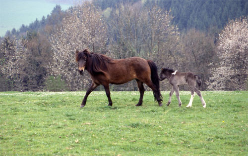 Auf dem Foto ist Snör mit ihrer Tochter Kvika von Rinkscheid von Skinfaxi vom Gartetal zu sehen. Weitere Fohlen sind Fjölnir von Ljósvængur fra Vestmose, der Orrigal vom Saringhof - Sohn Dreyri, der Tenor von Birkenlund - Sohn Randver sowie die Tochter Brana von Glitfaxi vom Sommerberg.